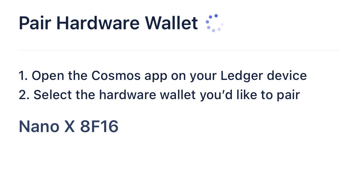 - Once you see the Keplr pop-up, connect and unlock your Ledger device, then open the Cosmos app inside Ledger. Then select the device you'd like to pair.